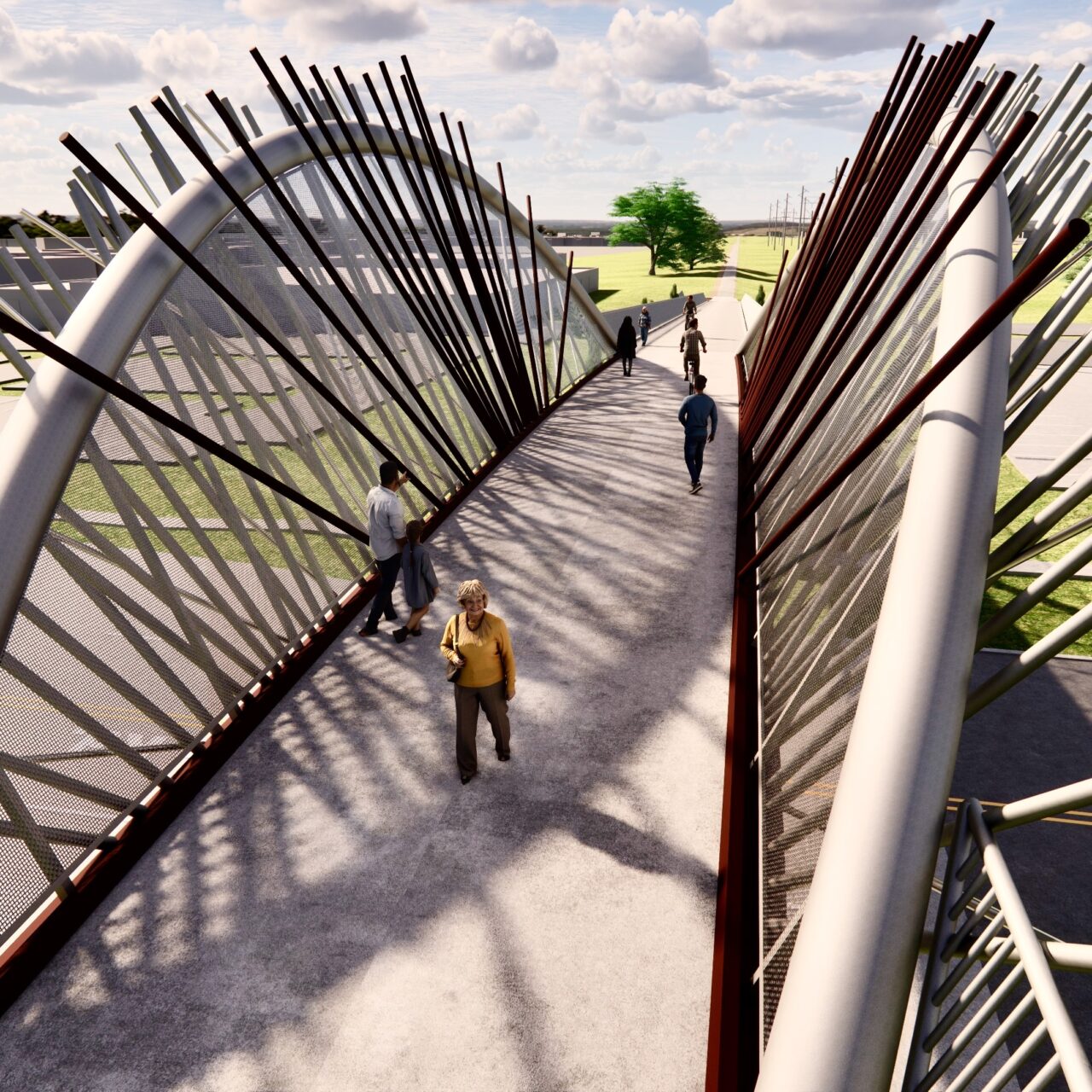 In May of 2024, Ed Carpenter was selected by a Wichita, Kansas art and infrastructure jury to design a 110’-long pedestrian bridge over four lanes of Rock Road, one of Wichita’s most prominent north-south boulevards. The bridge will serve the Redbud Trail, a popular rails-to-trails pathway spanning two counties along more than 15 miles repurposed for pedestrian and bicycle use. Construction and completion are scheduled for 2026.